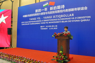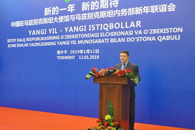 2019年1月12日,驻乌兹别克斯坦使馆与乌兹别克斯坦内务部举行新年联谊会。驻乌兹别克斯坦大使姜岩、乌内务部第一副部长纳扎尔穆哈梅多夫出席。