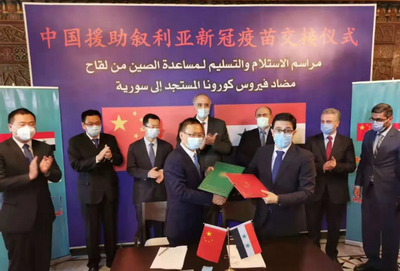 2021年4月24日,中国政府援助叙利亚新冠疫苗运抵叙首都大马士革。驻叙利亚大使冯飚、叙卫生部长加巴什、副外长贾法里等前往机场迎接,并出席疫苗交接仪式。