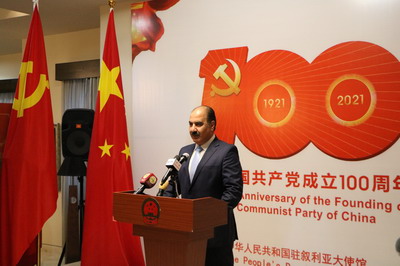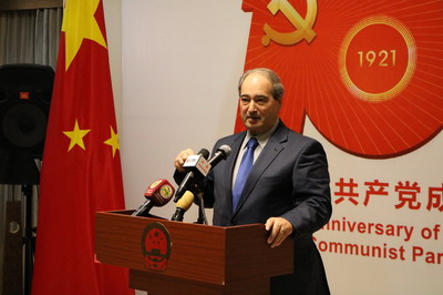 2021年6月22日,驻叙利亚大使冯飚在官邸举办庆祝中国共产党成立100周年招待会。叙利亚复兴党副总书记希拉勒、叙外长米格达德、叙统一共产党总书记哈里特、复兴党中央领导机构成员及叙外交部主要官员等约40人出席。