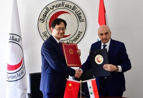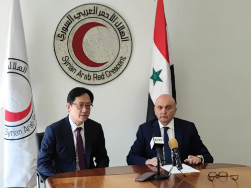 2023年6月11日,中国政府援助叙利亚3516吨粮食交接仪式在叙首都大马士革举行,驻叙利亚大使史宏微、叙红新月会会长哈立德·哈布巴提共同出席。