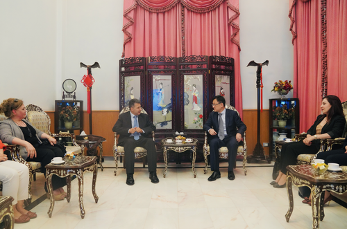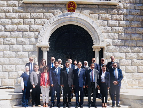 2023年6月20日,驻叙利亚大使史宏微在使馆同参加中阿改革发展研究中心叙利亚官员研修班的近20名学员座谈交流。