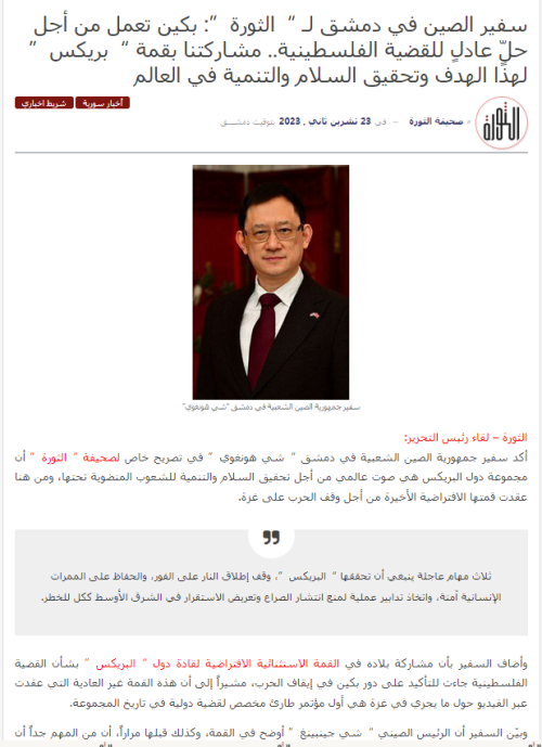 2023年11月23日,驻叙利亚大使史宏微接受叙主流媒体《革命报》书面采访,宣介习近平主席在金砖国家领导人巴以问题特别视频峰会上的讲话。