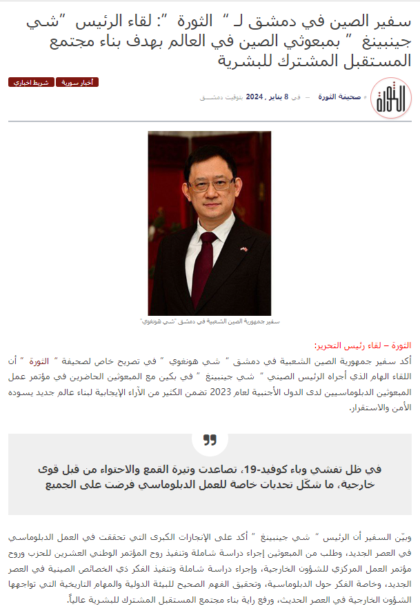 2024年1月8日,驻叙利亚大使史宏微接受叙主流媒体《革命报》书面采访,重点宣介中央外事工作会议精神。