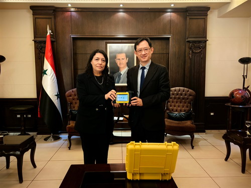 2024年1月24日,驻叙利亚大使史宏微会见叙地方管理和环境部部长拉米娅·沙库尔,向叙方捐赠用于房屋安全监测的裂缝综合测距仪,并就加强双边合作交换意见。