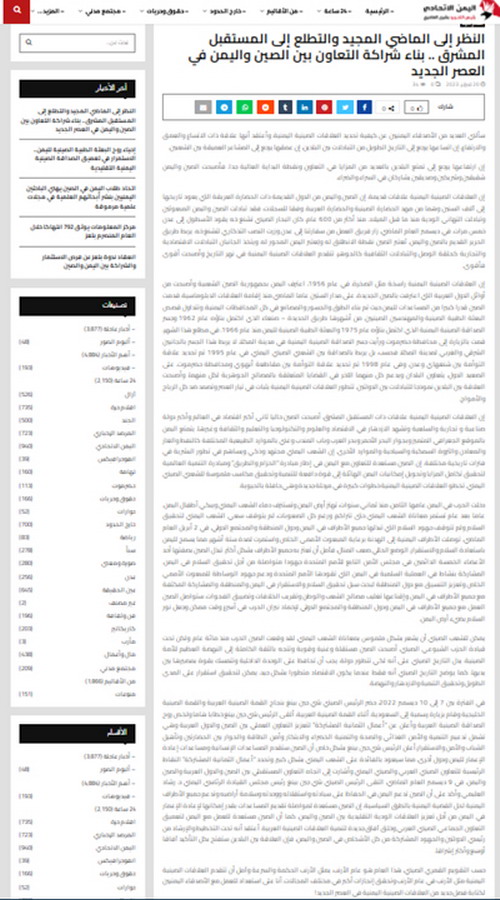 2023年2月20日,驻也门使馆临时代办邵峥通过也门联邦网等媒体发表署名文章《回首辉煌过去 展望美好未来 打造新时代中也合作伙伴关系》,全文如下: