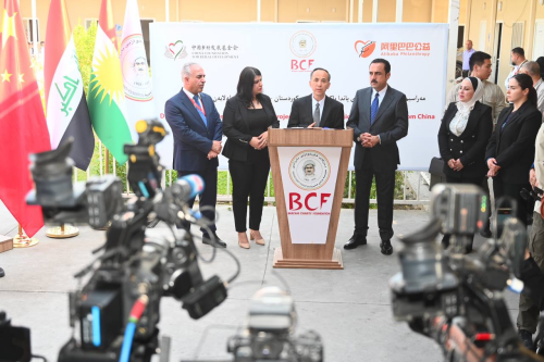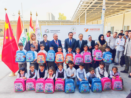刘军总领事、埃尔比勒省省长欧麦德、巴尔扎尼慈善基金会主席穆萨等出席仪式,并向无家可归者营地学校的小学生们发放印有熊猫图案的书包,孩子们非常高兴,学校师生们对中方的慷慨捐赠纷纷表达感激之情。