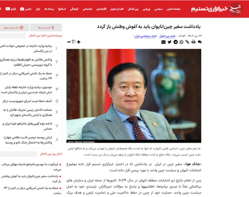 2024年1月19日,驻伊朗大使常华在伊朗塔斯尼姆通讯社发表署名文章《台湾必将回归祖国怀抱》。全文如下: