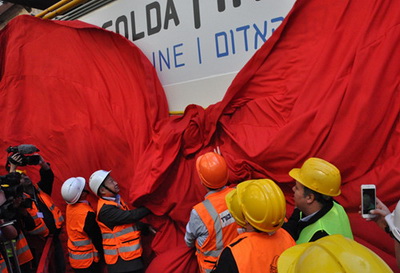 上午12时许,詹大使与卡茨部长来到特拉维夫红线地铁项目部施工现场井下,共同为“果尔达”号盾构机揭牌。该盾构机以以色列首位女总理果尔达·梅厄夫人的名字命名,表达了以色列民众对她的敬意。