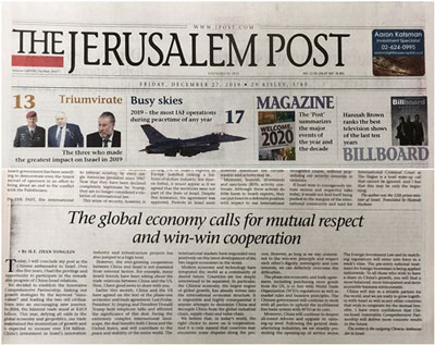 2019年12月27日,驻以色列大使詹永新在以色列发行量最大的英文报纸《耶路撒冷邮报》发表《相互尊重、互利共赢,为世界经济注入信心》的署名文章。全文如下: