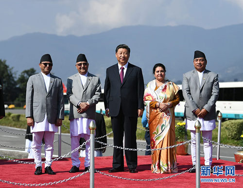 10月的加德满都,阳光灿烂,云卷风舒。喜马拉雅山巍峨耸立,见证着尼泊尔人民对中国领导人的深情厚谊。习近平抵达机场,班达里总统上前迎接。盛装的尼泊尔艺术家载歌载舞,少年儿童手持中尼两国国旗,用中文欢呼“习爷爷再见!”“我们爱您!”“欢迎您再次访问尼泊尔!”。习近平向欢送人群不时挥手致意。