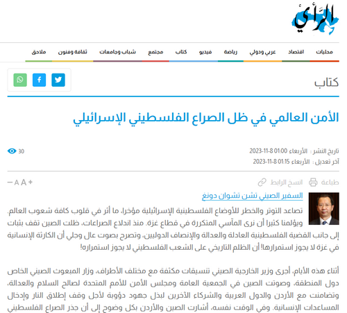 2023年11月7日,驻约旦大使陈传东在《言论报》《纳巴特人报》、阿蒙新闻网等约旦主要媒体发表署名文章《巴以冲突下对全球安全的思考》,阐述中国对近期巴以冲突立场,呼吁各方加强合作,落实全球安全倡议,为防止人道危机、推进中东和平进程、维护世界和平与安全做出应有努力。约旦通讯社等多家媒体转载、摘发。全文如下: