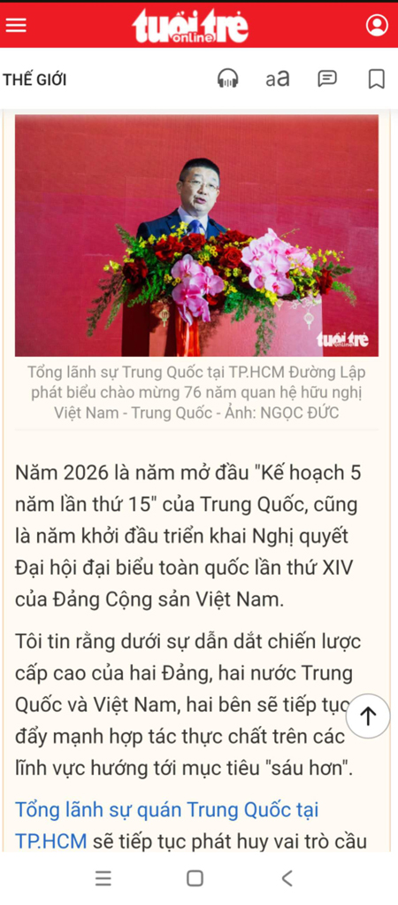 2026年3月25日,驻胡志明市总领事唐立在越南《年轻人报》发表署名文章《携手绘就澜湄合作新篇章》。文章全文如下: