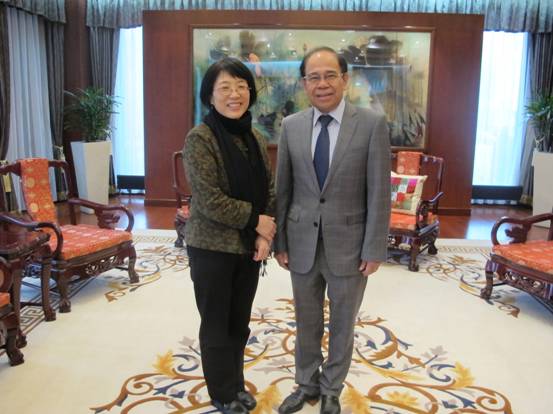 2015年4月1日,中国驻欧盟使团团长杨燕怡大使会见前来辞行拜会的柬埔寨驻欧盟大使韩·萨姆(HEM Saem)。双方就中柬关系、各自与欧盟关系等交换看法。
