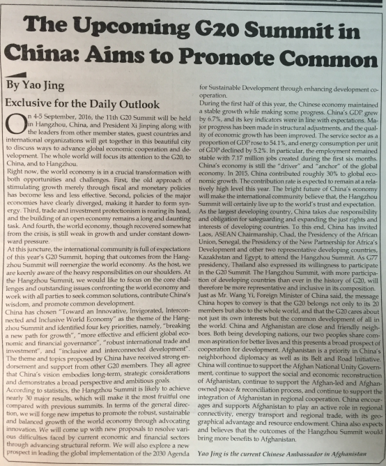 2016年8月8日,阿富汗主流英文报刊《每日瞭望报》评论版刊登中国驻阿富汗大使姚敬署名文章《即将在中国举行的二十国集团峰会旨在促进共同发展》。全文如下: