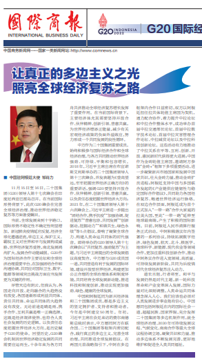 2022年11月15日,国际商报二十国集团(G20)国际经贸合作专刊刊发驻阿根廷大使邹肖力题为《让真正的多边主义之光照亮全球经济复苏之路》的署名文章,介绍二十国集团(G20)领导人第十七次峰会召开背景及中阿两国在多双边框架下合作情况。全文如下: