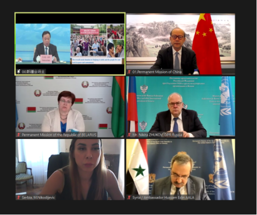 2022年6月23日,常驻日内瓦代表团和新疆维吾尔自治区共同举办“人民幸福生活是最大的人权”涉疆视频宣介会。常驻联合国日内瓦办事处和瑞士其他国际组织代表陈旭大使、30余国常驻日内瓦代表和高级外交官、联合国人权高专办官员、记者等60余人参加。