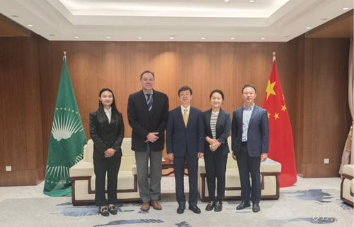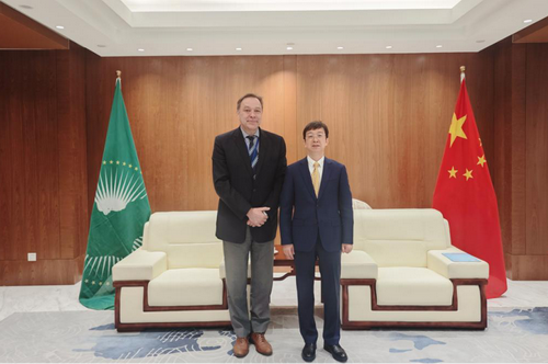 2025年9月16日,驻非盟使团团长蒋烽大使会见联合国教科文组织非洲国际能力建设研究所主任沃顿。