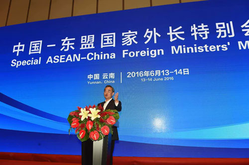 2016年6月13日晚上,外交部长王毅在云南玉溪为出席中国—东盟国家外长特别会议的各国外长举行欢迎晚宴并致辞。