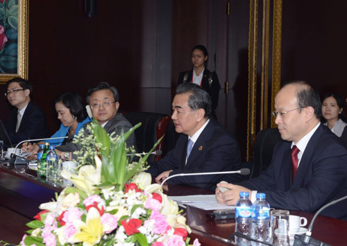 当地时间2016年7月24日,中国外交部长王毅在老挝万象会见缅甸国务资政兼外长昂山素季。