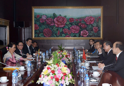 昂山请王毅转达对中国领导人的问候。昂山表示,对缅来说,中国是抱有善意的最大邻国,两国人民是好邻居好朋友,缅中关系民意基础深厚。缅方赞赏中国为缅经济发展和民族和解进程提供的支持和帮助,值此缅发展建设的重要时期,希望中国作为缅的好朋友继续予缅以支持。缅方希与中方共同努力,继续打造积极和强有力的关系,相信缅中两国传统友谊和友好合作将世代相传下去。