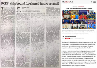 2021年12月31日,印尼《雅加达邮报》及其网站分别刊发驻东盟使团临时代办蒋勤署名文章《RCEP:巨轮启航 共享未来》。文章内容如下: