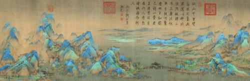 《千里江山图》是中国北宋著名画家王希孟所作,现藏于故宫博物院,是北宋青绿山水画杰出代表。此画所描绘的锦绣山河,峰峦起伏绵延,江河烟波浩渺,气象万千,壮丽恢弘,被誉为“中国十大传世名画”之一。