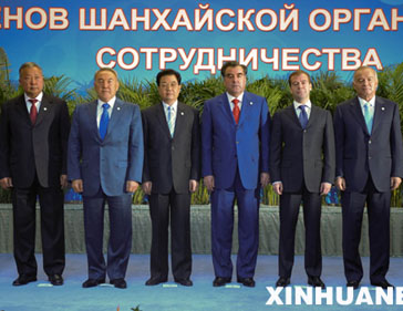 8月28日,国家主席胡锦涛在塔吉克斯坦杜尚别出席上海合作组织峰会时同各成员国元首合影。