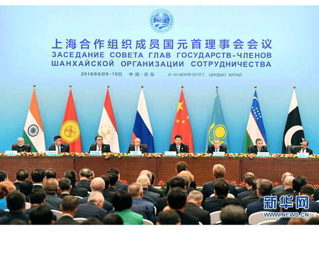 2018年6月10日,上海合作组织成员国领导人共同会见记者。国家主席习近平作为主席国元首发表讲话。印度总理莫迪、哈萨克斯坦总统纳扎尔巴耶夫、吉尔吉斯斯坦总统热恩别科夫、巴基斯坦总统侯赛因、俄罗斯总统普京、塔吉克斯坦总统拉赫蒙、乌兹别克斯坦总统米尔济约耶夫出席。