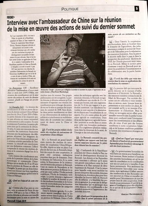 2019年6月11日,驻布隆迪大使李昌林就中非合作论坛北京峰会成果协调人会议接受了布隆迪官方报《新生报》记者的采访。