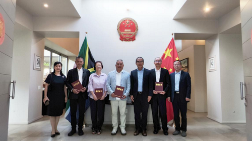 2026年1月22日,驻约翰内斯堡总领事潘庆江会见领区侨胞陈玉玲、卢伟亮、郑明和鲁津浦等,向他们转交外交部乡村振兴定点工作领导小组办公室颁发的捐款荣誉证书和有关感谢信。