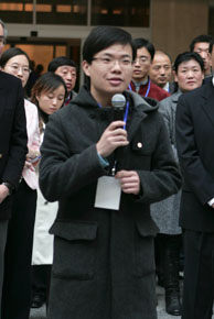 北京大学青年外交学会的一名同学代表来宾发表感言,感谢外交部为广大学生提供近距离接触外交、了解奥运的机会,表示将努力学习外交知识、支持国家外交工作,在奥运会期间展示中国当代大学生文明向上、热情开放的精神风貌。
