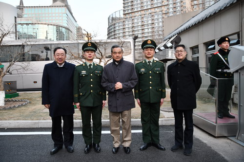 2019年2月3日下午,王毅国务委员兼外长来到外交部值守应急中心、领事保护中心、信息中心、礼宾服务中心、楼宇安全监控中心、驻部武警岗哨等春节期间值班单位,看望慰问干部职工和执勤武警战士,致以诚挚的新春祝福。部党委书记齐玉和乐玉成副部长参加慰问。
