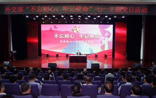 2019年7月4日,外交部举行2019年“不忘初心、牢记使命”“七一”主题党日活动,隆重庆祝中国共产党成立98周年。国务委员兼外交部长王毅出席并为全体党员讲党课,外交部党委书记齐玉讲话并向新党员代表赠书,外交部部长助理刘显法带领新党员代表进行入党宣誓,在场全体党员在庄严的气氛中重温入党誓词。在京部党委成员、中央“不忘初心、牢记使命”主题教育第十三指导组组长王万宾、副组长黄宪起,中组部、中央和国家机关工委有关负责同志,部内部属单位主要负责人及班子成员、基层党员和离退休党员代表等近700人参加。