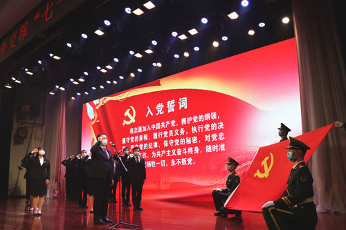 2020年7月8日,外交部举行“党旗在外交战线高高飘扬”2020年“七一”主题党日活动,隆重庆祝中国共产党成立99周年。外交部党委书记齐玉同志围绕“强化外交战线政治机关意识,走好第一方阵”讲专题党课,机关党委书记马朝旭同志带领预备党员代表进行入党宣誓,在场全体党员在庄严的气氛中重温入党誓词。部党委成员、部内部属各单位主要负责人和党员代表出席,机关党员干部通过闭路电视集中观看。