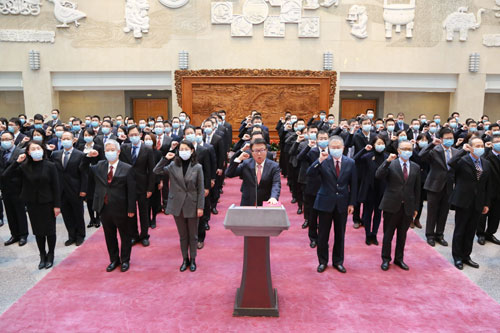 2020年12月4日,在第七个国家宪法日之际,外交部隆重举行2020年度新任司处领导干部宪法宣誓仪式。外交部党委书记齐玉监誓。