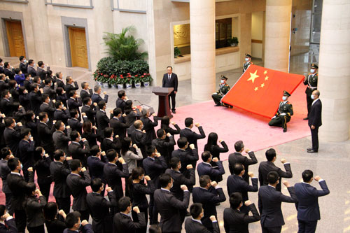 下午4时30分,宪法宣誓仪式开始。全体宣誓人面向国旗,高唱中华人民共和国国歌。随后,领誓人手抚宪法,领诵誓词,外交部部内部属单位140余位司处领导干部右手举拳,庄严宣誓。