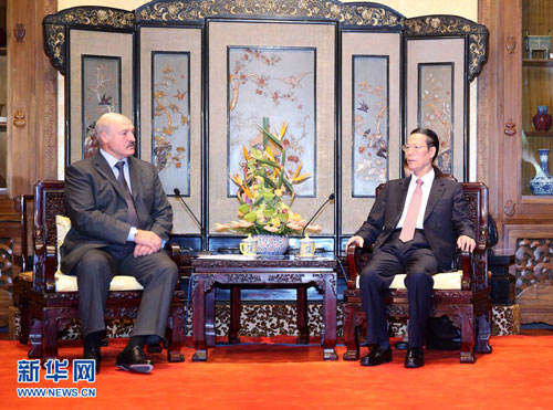 2015年9月2日,中共中央政治局常委、国务院副总理张高丽在钓鱼台国宾馆会见来华出席中国人民抗日战争暨世界反法西斯战争胜利70周年纪念活动的白俄罗斯总统卢卡申科。