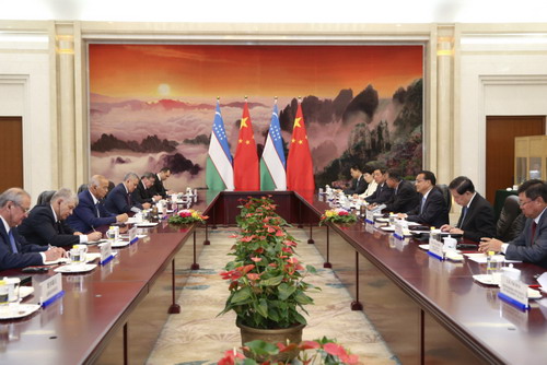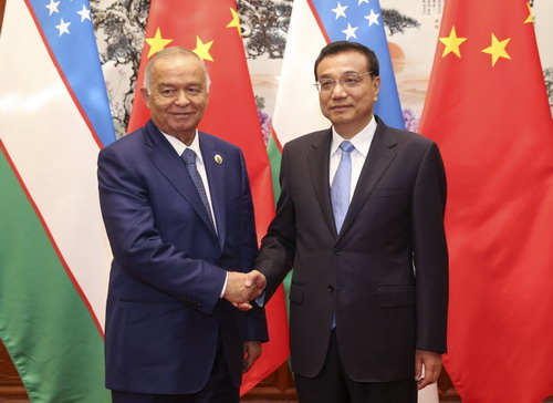 2015年9月3日下午,国务院总理李克强在人民大会堂会见来华出席中国人民抗日战争暨世界反法西斯战争胜利70周年纪念活动的乌兹别克斯坦总统卡里莫夫。