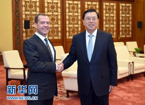 2015年12月16日,全国人大常委会委员长张德江在人民大会堂会见俄罗斯总理梅德韦杰夫。
