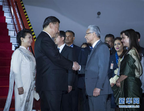 当地时间晚9时15分许,习近平乘坐的专机抵达拉姆古兰国际机场。毛里求斯总理贾格纳特到机场迎接。当习近平和夫人彭丽媛步下舷梯,贾格纳特和夫人科比塔迎上前去。科比塔向彭丽媛献上鲜花。