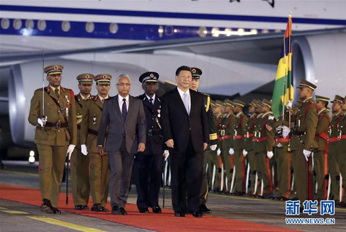 两国领导人登上检阅台。军乐队奏中毛两国国歌。在贾格纳特陪同下,习近平检阅仪仗队。现场奏响中国歌曲《我的中国心》。检阅后,两国领导人共同前往接待大厅。习近平和彭丽媛同毛方迎接人员握手。贾格纳特夫妇同中方陪同人员握手。