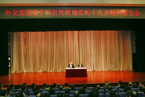 2017年11月17日,外交部党委举行学习宣传贯彻党的十九大精神报告会,王毅部长作专题报告,张业遂书记主持,部内部属单位领导班子成员、处级以上干部、在京驻外大使、总领事和离退休老同志代表约700人出席。全部党员干部通过闭路电视收看了报告会现场直播。