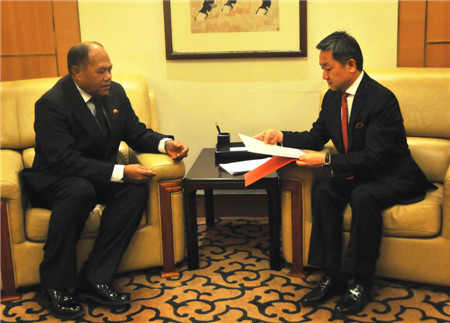 2015年2月16日,外交部礼宾司副司长张益明分别接受中非新任驻华大使姆巴佐阿和汤加新任驻华大使乌塔阿图递交的国书副本。