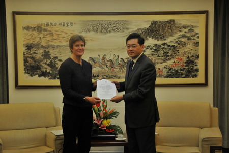 2015年2月25日,外交部礼宾司司长秦刚接受英国新任驻华大使吴百纳(女)递交的国书副本。吴于20日抵京。