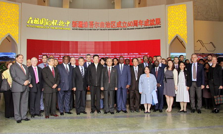 2015年10月16日上午,外交部组织驻华使节赴民族文化宫参观“在祖国的怀抱中---新疆维吾尔自治区成立六十周年成就展”。朝鲜、菲律宾、秘鲁、贝宁、赤道几内亚、尼日尔、汤加、马拉维、毛里求斯驻华大使,国际竹藤组织驻华代表等约80位使节参加。新疆维吾尔自治区党委常委、宣传部长李学军,外交部礼宾司、办公厅、各地区司和国际司负责人等陪同参观。