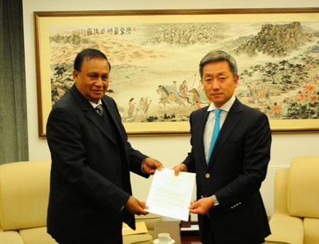 2015年11月16日,外交部礼宾司副司长张益明接受斯里兰卡新任驻华大使科迪图瓦递交的国书副本。
