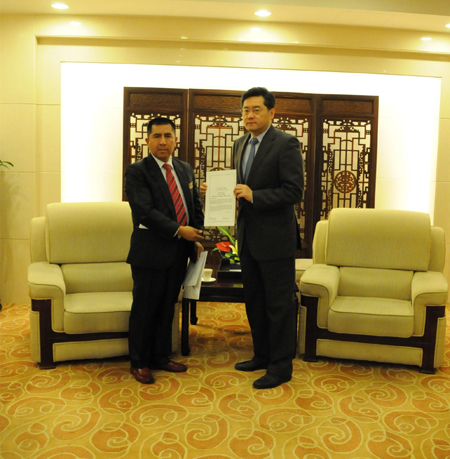 外交部礼宾司司长秦刚接受玻利维亚新任驻华大使递交国书副本