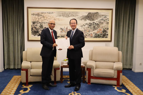 2020年8月18日,外交部礼宾司司长洪磊接受巴基斯坦新任驻华大使莫因·哈克递交的国书副本。莫因·哈克大使于7月31日抵京。