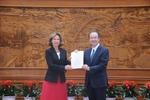 2020年10月28日,外交部礼宾司司长洪磊接受英国新任驻华大使吴若兰递交的国书副本。吴若兰大使于10月10日抵京。