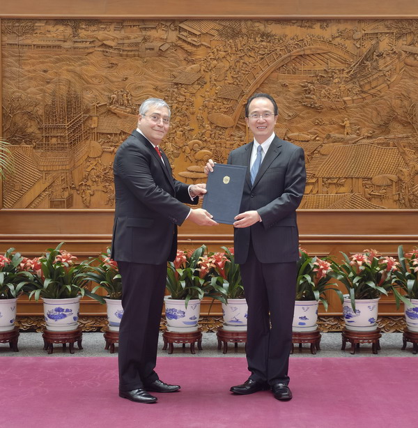 2022年6月7日,外交部礼宾司司长洪磊接受委内瑞拉新任驻华大使约夫雷达递交的国书副本。约夫雷达大使于5月8日抵华。